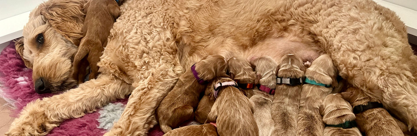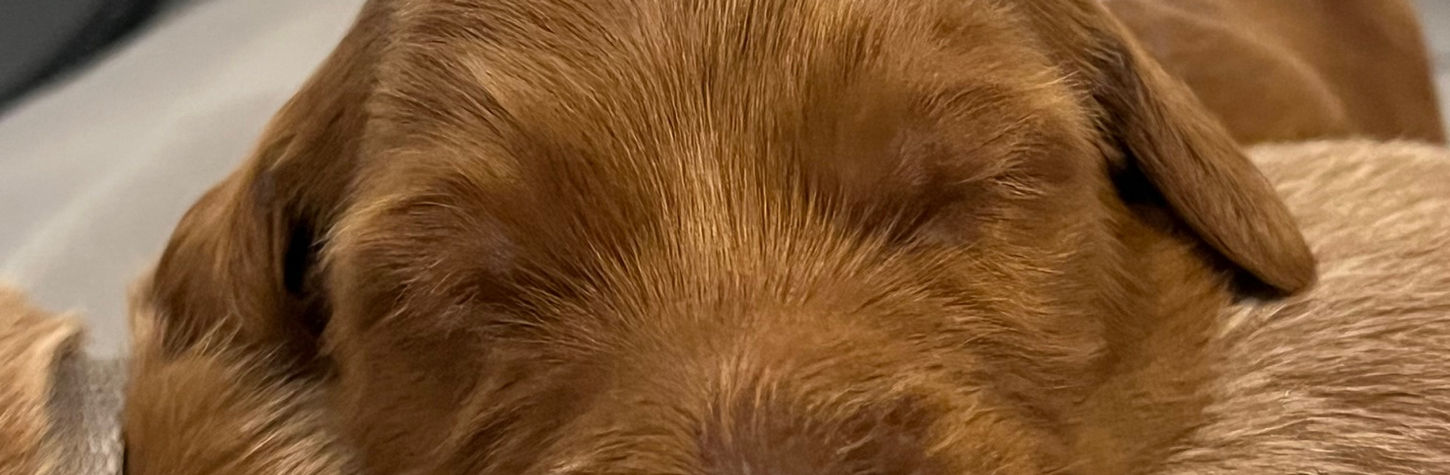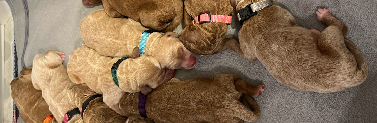 Halli and Camp churned out ten adorable pups on November 26th, 2023, a perfect blend of five girls and five boys, ranging from apricot to dark red. With two curly coats, at least two straight coats, and the rest sporting wavy fur, they're a brie-lievable mix. Weighing in from 45 to 65lbs, most will land around 55-60lbs, making them as substantial as a wheel of cheese. Among them, Brie stood alone as the big cheese, selected to continue the lineage at Mandi's Doodles. She's a gouda girl with her sweet demeanor and zippy spirit. All pups are sharp as cheddar, highly trainable, and as happy as mice in a cheese cellar! These little cheesemongers are as sharp as aged cheddar, ready to be trained and spread joy like cream cheese on a bagel!
